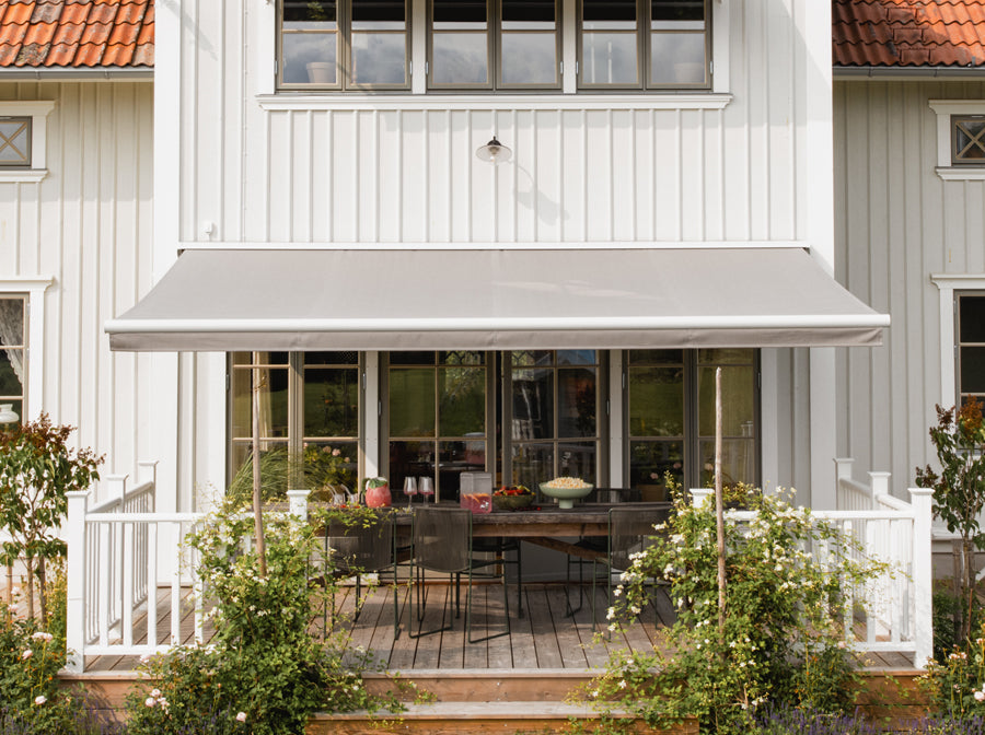 Terrassmarkisen är det perfekta valet för att fullborda uteplatsen eller balkongen, med en stilren design och tak som tillval för att skydda markisduken i infällt läge.
